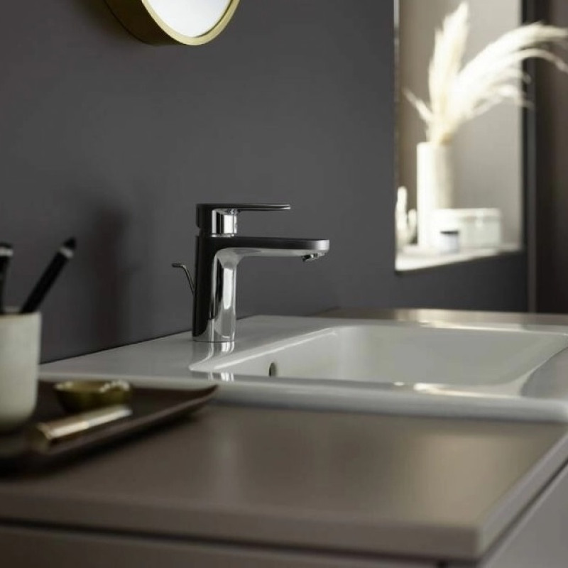 Однорычажный смеситель для умывальника, цвет - хром, керамический картридж, гибкая подводка G3/8” 350 мм длина, низкий расход воды - до 5 л/мин (при 3 барах), система упрощенного монтажа, металлическая рукоятка с индикацией горячей и холодной воды.